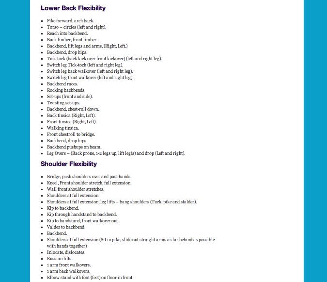 I know that my back flexibility is nothing like it used to be but keeping my shoulders flexible has really helped keep my basic tumbling ability. I’m hoping these can improve both. These come from Coach Howard at GymnasticsZone.com. Read the full list of article HERE